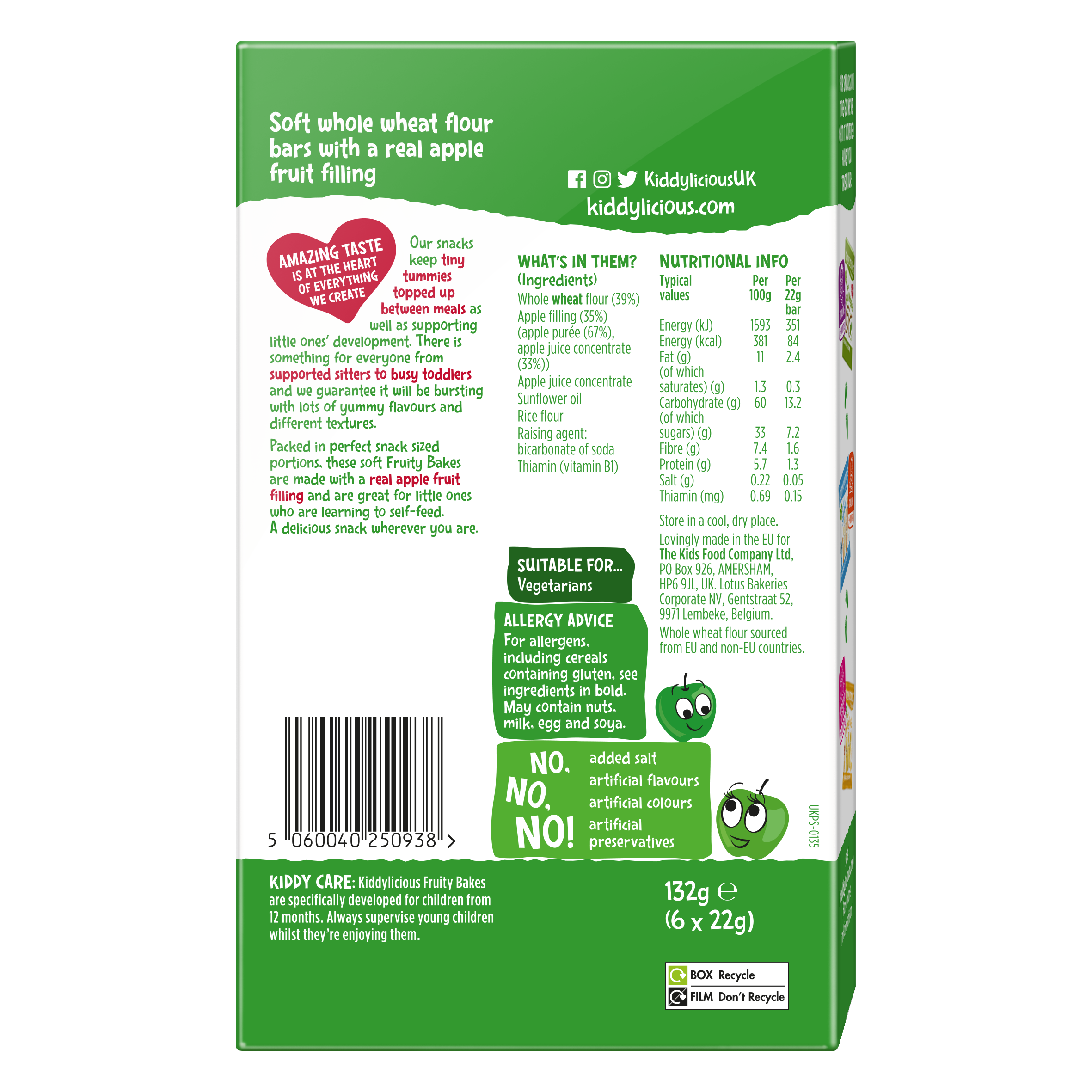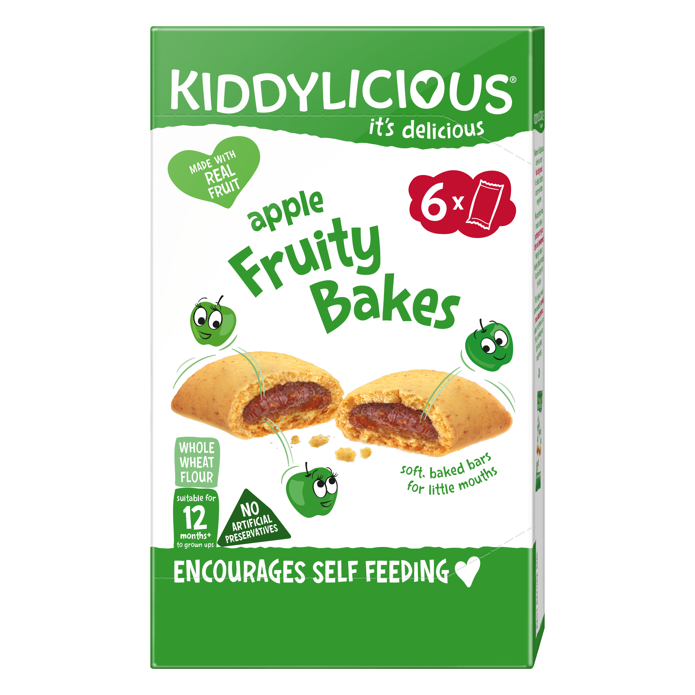 Do zlatova pečené ovocné koláčky Kiddylicious jsou vyrobeny z celozrnné pšeničné mouky se skutečnou ovocnou náplní – jablečnou či jahodovou. Lahodné koláčky jsou měkké a neobsahují žádný přidaný cukr. Jsou vhodné pro děti od 12 měsíců.