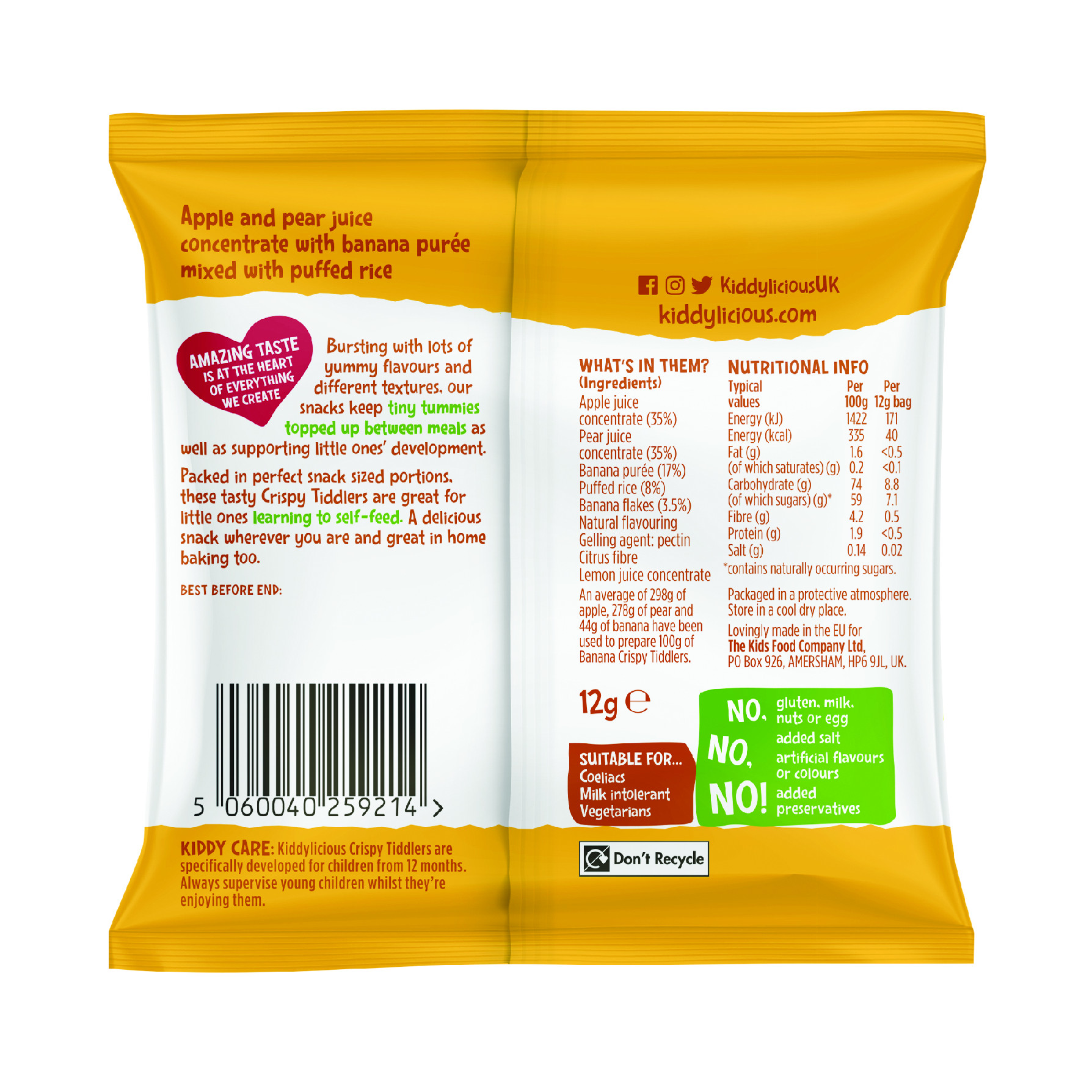 Banánové křupavé rybičky Kiddylicious jsou dokonalou a zdravou sladkostí. Jsou vyrobeny z pravého ovoce a ovocné šťávy, načež tuto směs rozmixujeme s křupavými kousíčky rýže a vytvarujeme je do rozkošného tvaru rybiček.