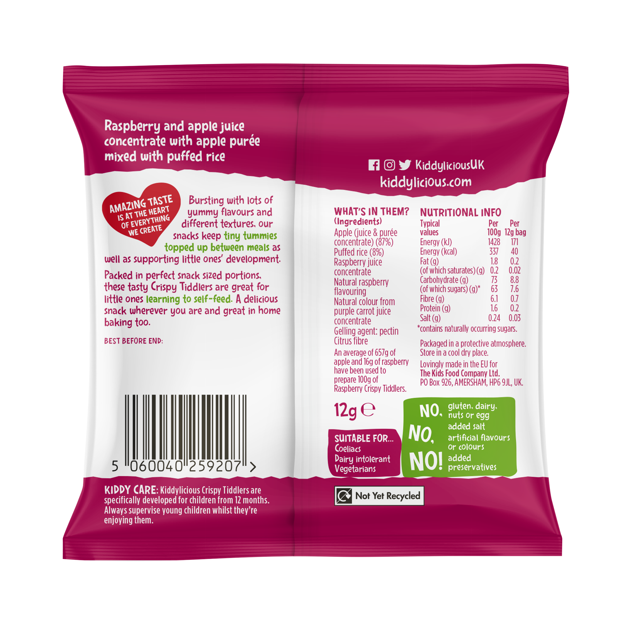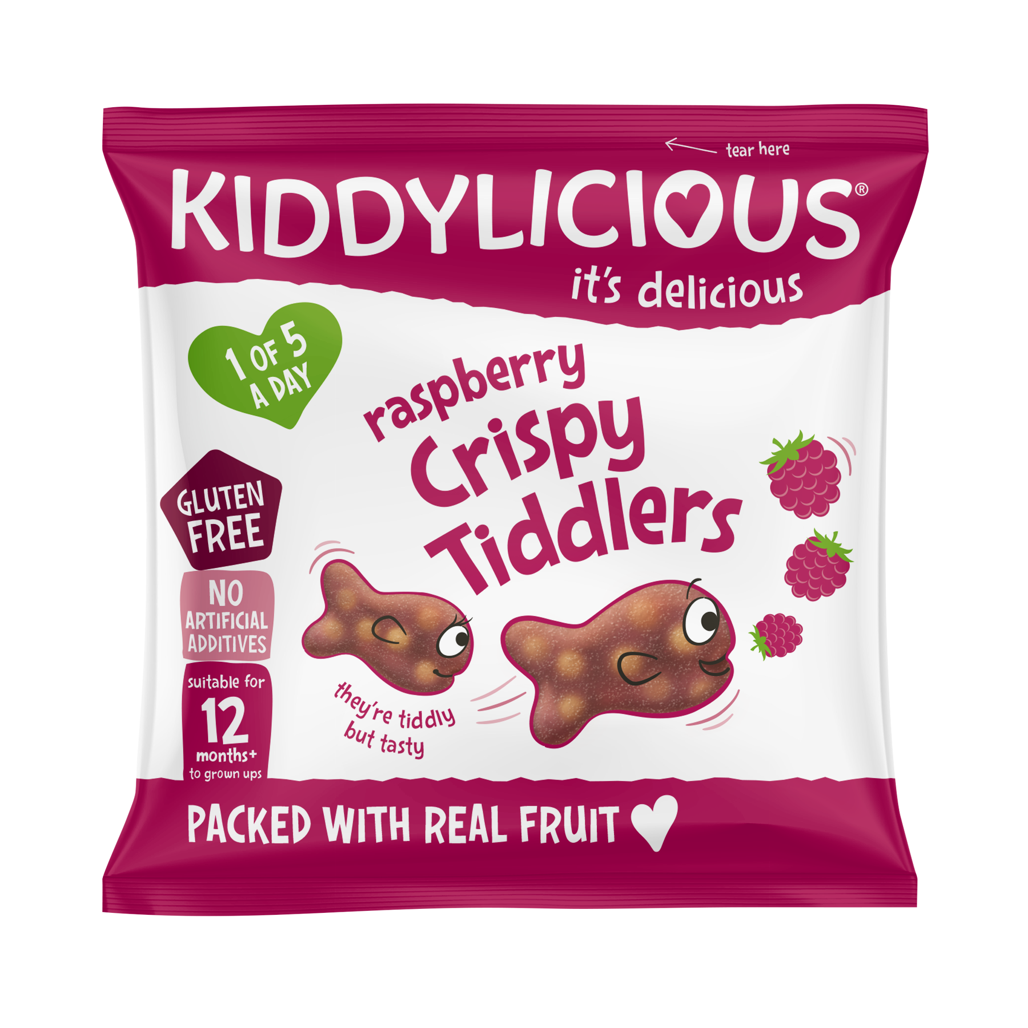 Malinové křupavé rybičky Kiddylicious jsou dokonalou a zdravou sladkostí. Jsou vyrobeny z pravého ovoce a ovocné šťávy, načež tuto směs rozmixujeme s křupavými kousíčky rýže a vytvarujeme je do rozkošného tvaru rybiček.